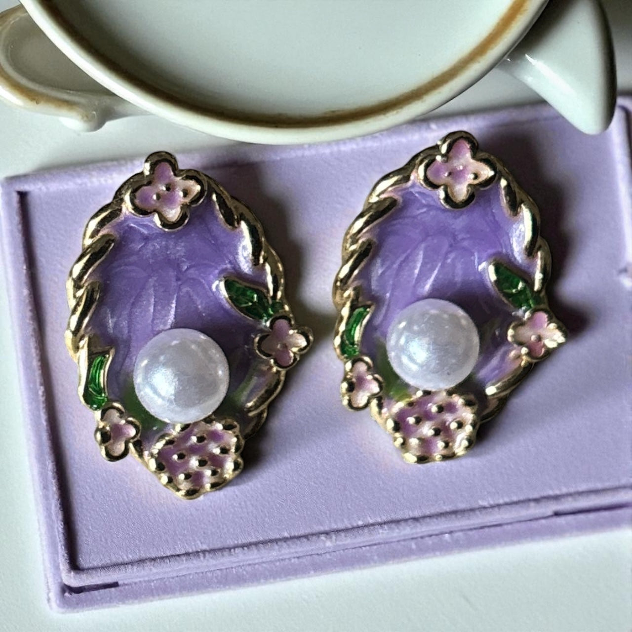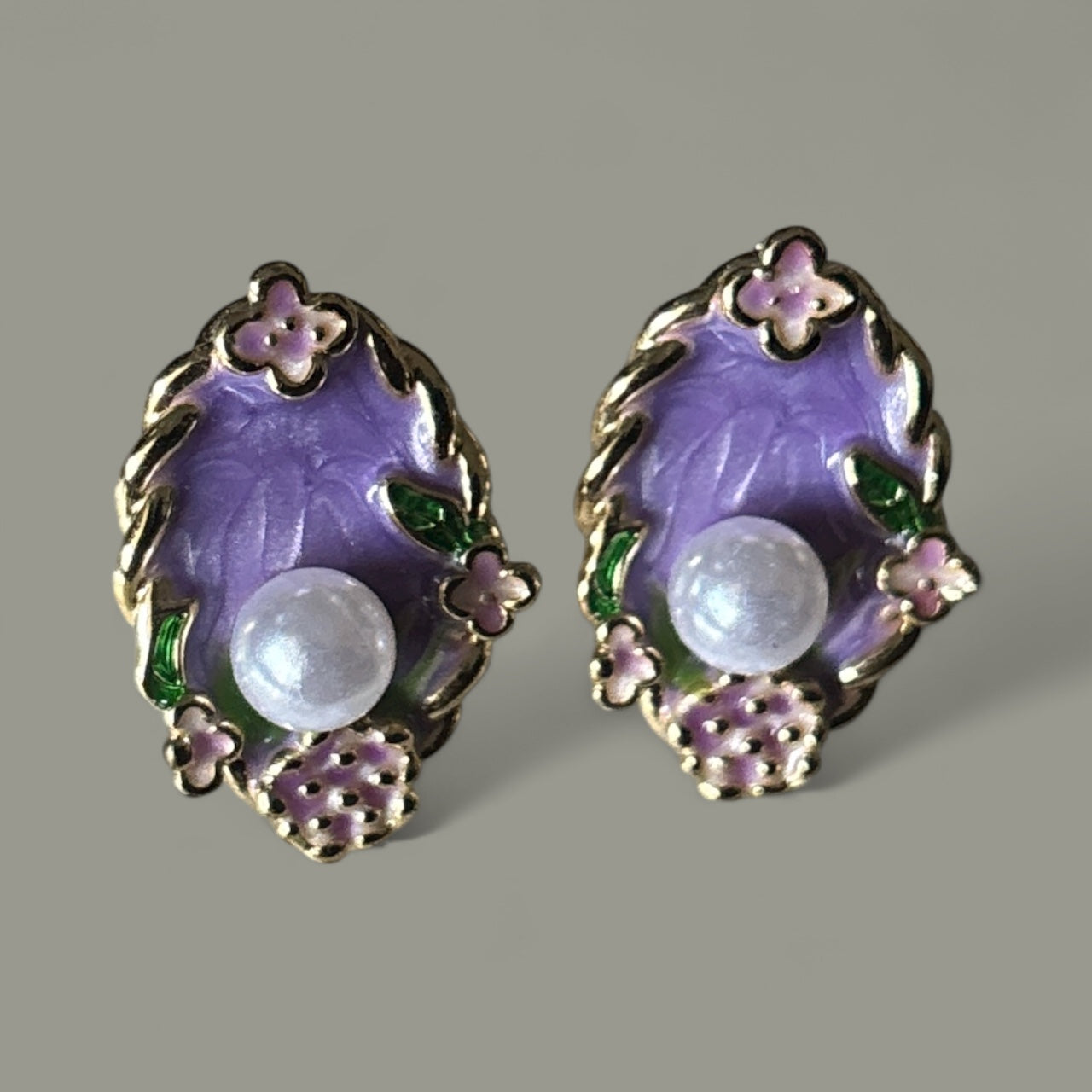Delicate and charming, these vintage-inspired earrings feature a purple enamel base adorned with floral details and a pearl centerpiece. Perfect for adding elegance to any outfit.