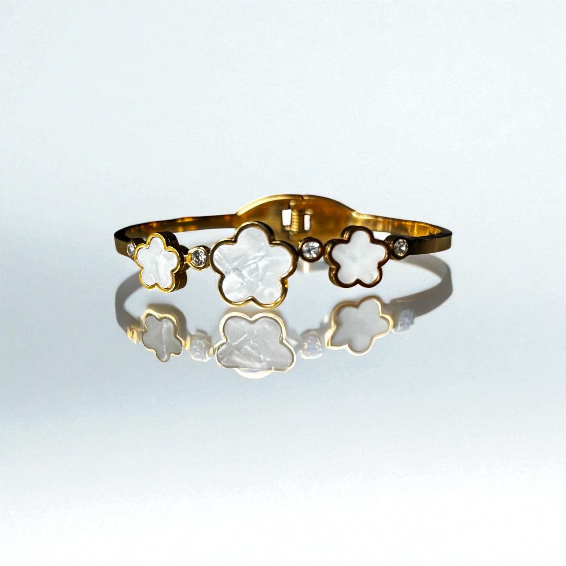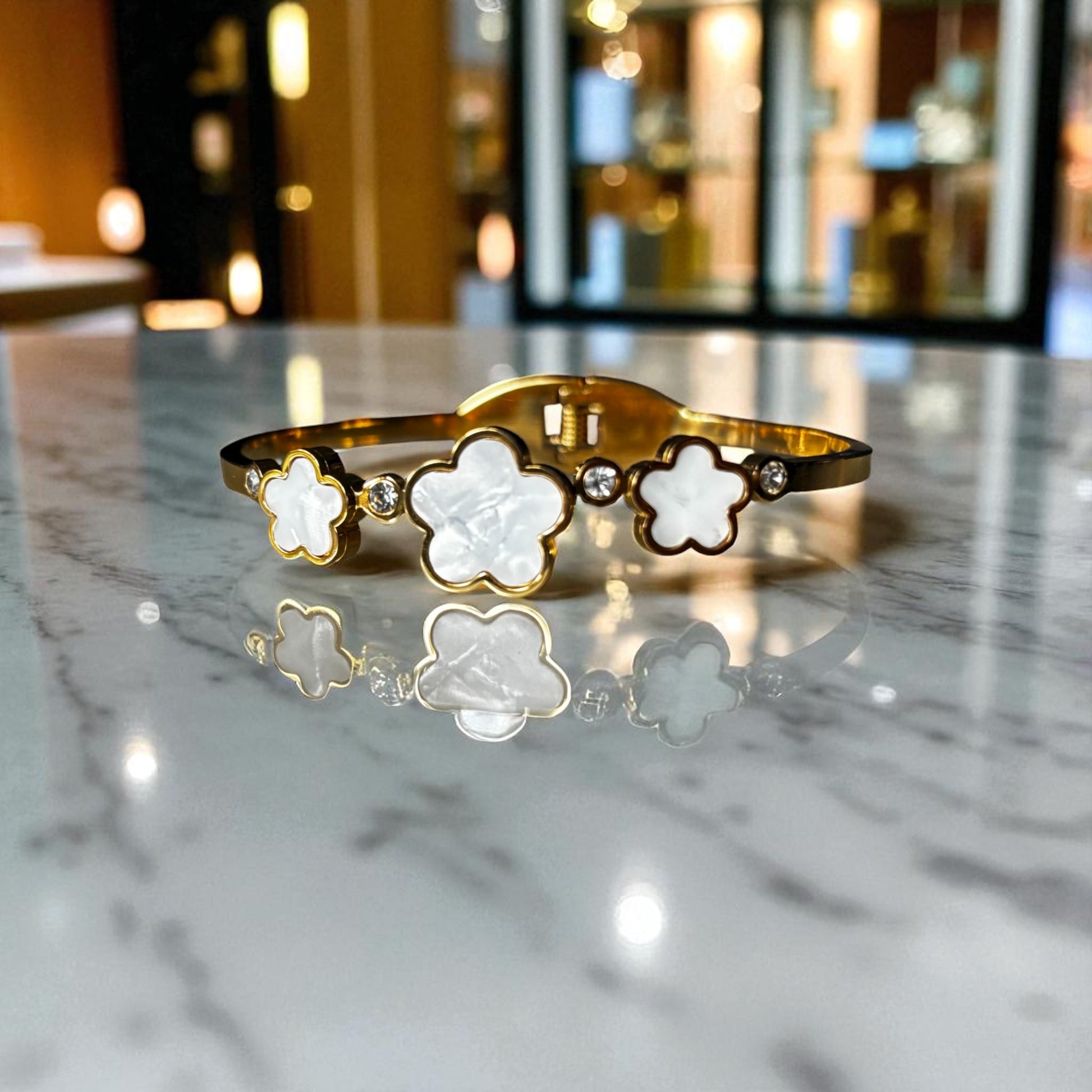 18K Gold Plated. A timeless bracelet featuring luminous white mother-of-pearl clovers framed in gold with sparkling crystal accents. Elegant, chic, and perfect for everyday wear or special occasions.